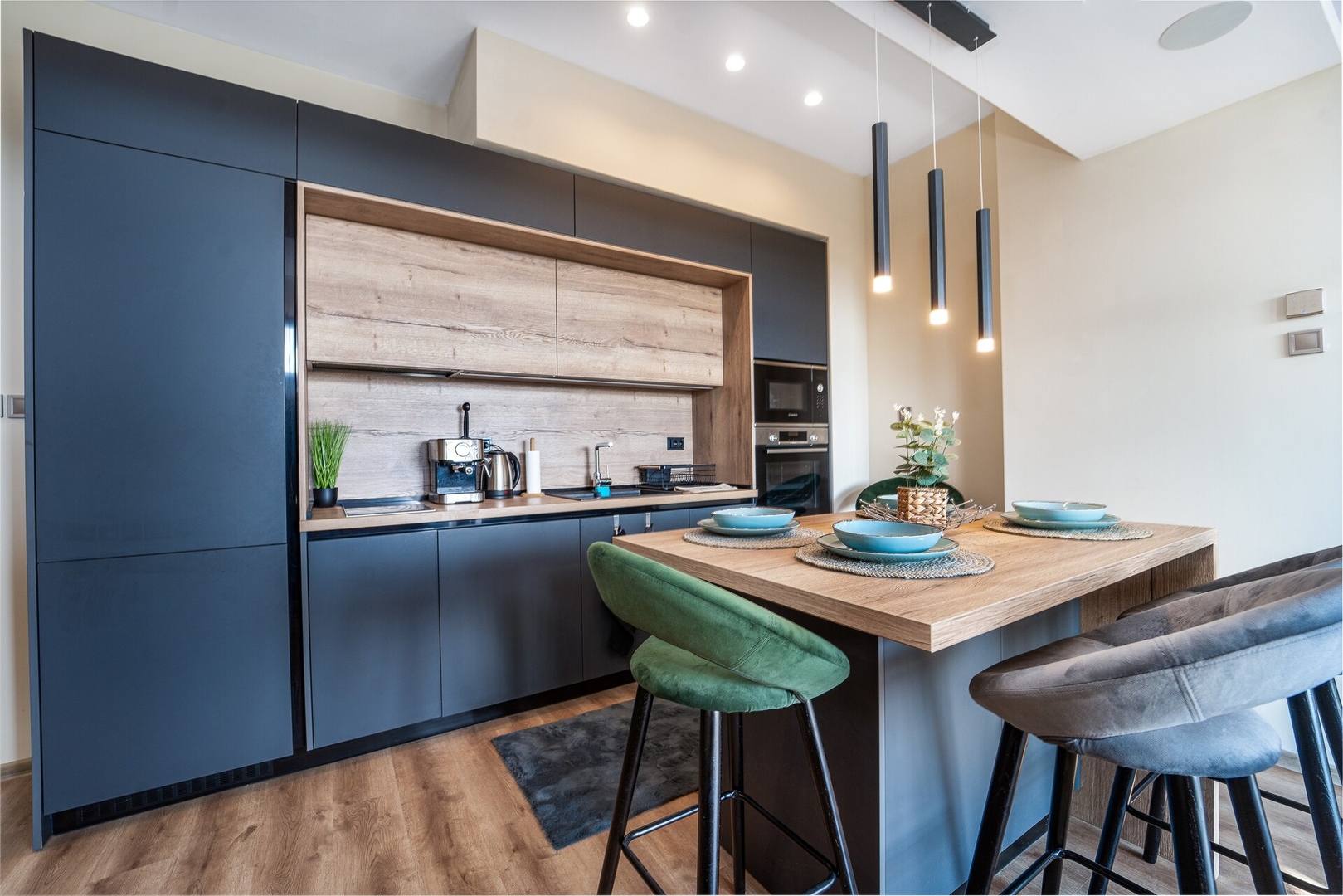 The apartment has a bright living room with a comfortable sofa with a sleeping function, a flat smart TV, and cable. The Kitchen is completely functional with a stove, a fridge, an oven, hot water kettle, coffee machine plus all needed cutlery. The 1 bedroom is located on the left part of the apartment, a new mattress ideal size for two adults. Modern new bathroom decorated with a stylish urban feel.